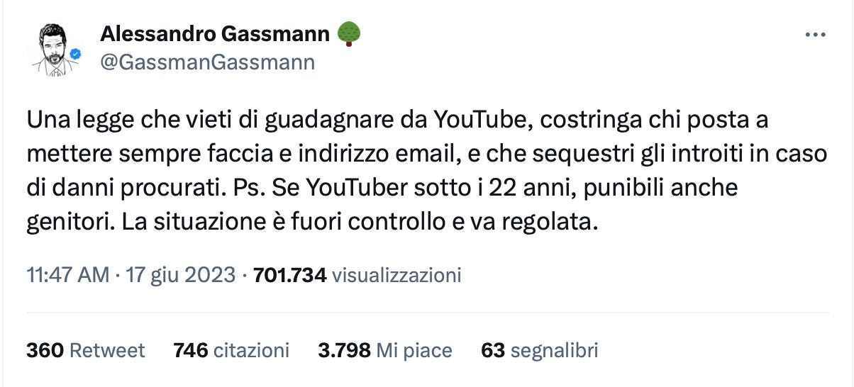 L’obbligo di mail fa sorridere, perché mostra che Gassmann parli di qualcosa di cui ha zero concezione; ogni account YouTube è già legato a una mail…